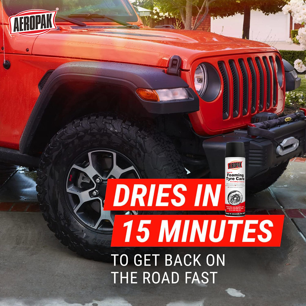 Aeropak Foaming Tire Care contient un ingrédient macromolécule qui pénètre pour éliminer la saleté de la route, la poussière de frein, la saleté, le film et la graisse.